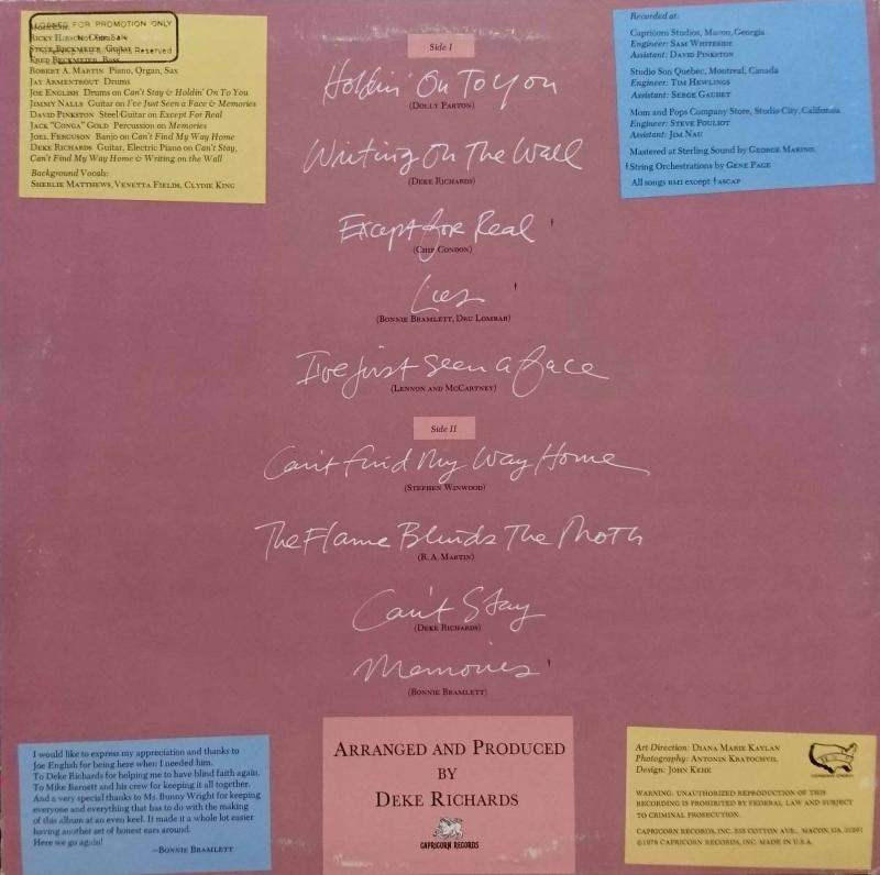 LAスワンプ・ロックの象徴だったボニー・ブラムレットのソロ4作目。キャプリコーン・レーベルに移ってからの3作目で、バックはウエット・ウィリーのリッキー・ハーシュやフル・ムーンのフレッド・ベックマイヤーらが務めており、前作に比べて知名度の高い人はいないが、バック・ヴォーカルはシャーリー・マシューズ、ヴェネッタ・フィールズ、クライディー・キングとブラックベリーズの3人が担当している。取上げている曲は、ドリー・パートンで知られる「Holdin' on to You(あなたを慕って)」、ビートルズ・ナンバーの「I've Just Seen a Face(夢の人)」、ブラインド・フェイスが演じた「Can't Find My Way Home」と、今までのソウル色の強いものから、今回は幅広い選曲となっている。ソウルフルな唄い方に変わりはないが、ストリングスが入る曲が4曲あり、マイルドな印象を受ける